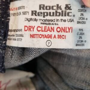 Rock & Republic Stella low rise straight leg jeans with Swarovski crystals on back pockets. Logo tab on front pocket and logo patch on back waistband. R's stitched on back pockets encrusted with red crystals. Size 25