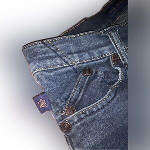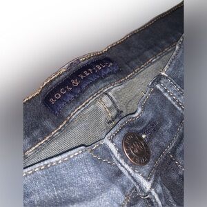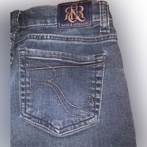 Great pair of jeans by Rock & Republic! Dark wash with light acid wash on the thighs. R silhouette embroidered on the back pockets. Boot cut and low-mid rise. Great preowned condition! No holes or stains and smoke free! Size 4. Please refer to measurements before purchasing!