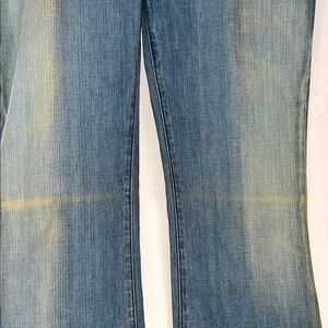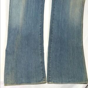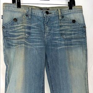 (T14). Stylish flare leg jeans with a light blue wash. Perfect for casual outings. Waist 18”, Inseam 33-34”, Rise 8-9” Approximate measurements, Slight Stretch, Like new condition.