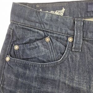 The Rock & Republic Men's ButtonFly Floyd Blue Jeans in Intense Indigo are vintage originals with premium quality from before 2011, featuring a mid-rise and straight fit in a classic denim fabric. They are adorned with branded button fly and rivets, along with embroidered logos and povkets, adding a touch of style and flair. These jeans have a comfortable and stretchy feel, with a 5-pocket design and a 34-inch inseam, making them perfect for year-round wear in any season. Made in the USA, these jeans bear the iconic Rock & Republic brand from prior to 2011 ownership change and are machine washable for easy care. Perfect for those looking for a pair of designer jeans with a modern twist.