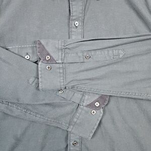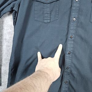 This is a dark green "weave" pattern Rock & Republic 100% cotton button up long sleeve shirt. The tag size is XXL. There are 2 breast pockets with flap/button closure. The insides of the cuffs are black, so there is a nice contrast when the sleeves are rolled. There are 2 spots, pointed out in the photos.