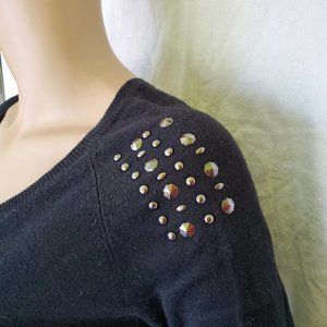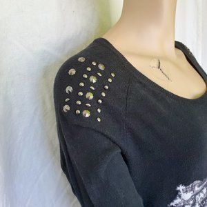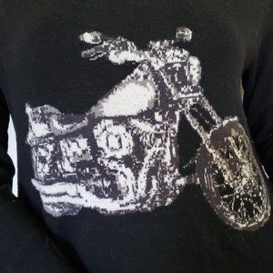 Black sweater with motorcycle on front. Shoulders have stud embellishments (a few are missing). Overall good condition. See photos for detail.