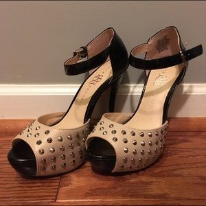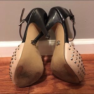 Very cute and edgy heel from Rock & Republic. Some visible wear on bottom and heels, also one of the straps that holds the ankle strap flush against the shoe is missing - could be easily fixed, bit is hardly noticeable.