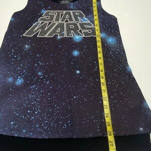 Star Wars tank top with galaxy print. Comfortable and stylish. Features glitter and glows in the dark.