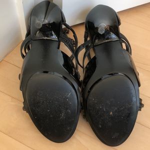 Black strappy sandals with gunmetal/black pyramid stud and chain accents