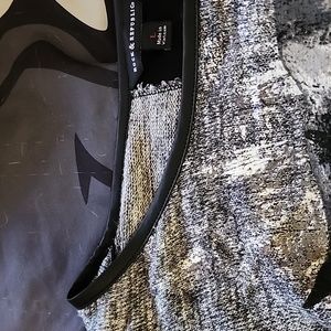 Thin high-low top in a sparkly gray with steer skull image and faux leather detailing at collar and on the back.
