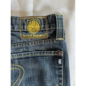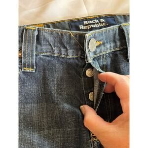 Nice pair of Rock and Republic jeans, medium to dark wash, not distressed. Button fly, Henlee style, size 38. Jean tag shows 38” but my measurement shows 37.5”. Please message me with any questions. Thank you.