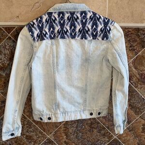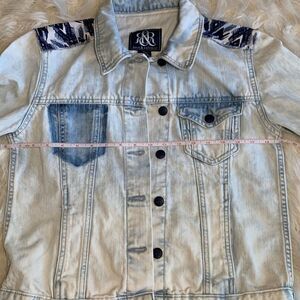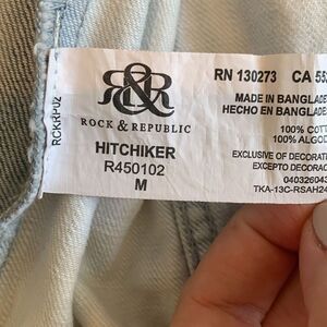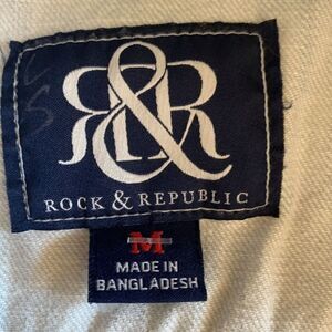 Rock & Republic Womens Hitchhiker Indigo Native Distressed Denim Jacket Size Med Excellent Condition Rock & Republic Denim Jacket Hitchhiker Aztec Accent Women's Size Medium Great. It is made of 100% cotton. It has a whitewash look with an Aztec like pattern across the shoulders with distressed edges. Please check measurements as preowned item measurements may vary.