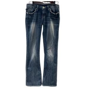 Embellished light to medium wash Rock & Republic boot cut Kasandra jeans. Wear on knee areas. In good used condition.