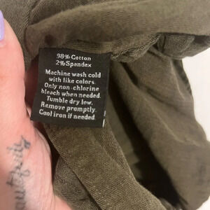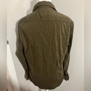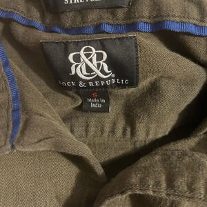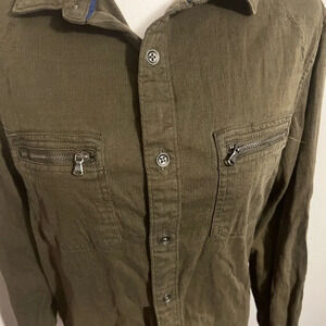 Rock & Republic army green button down women’s shirt. Size small. Excellent used condition. Minor fraying. Each pocket of chest has a zipper. Minor color fading at the neck.