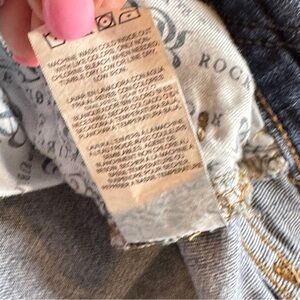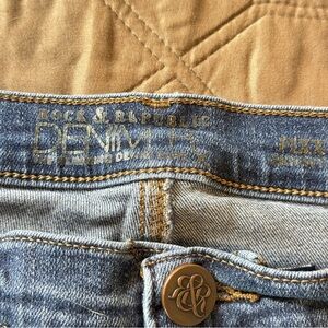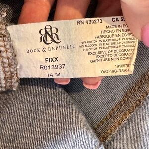 The Rock & Republic sz 14 FIXX Denim women's jeans in blue offer a stylish and comfortable option for any season. These low-rise stretch jeans feature a distressed look and a 5-pocket design, perfect for a casual yet fashionable style. Made from spandex, cotton, and elastane, these jeans are machine washable and designed for a regular fit.