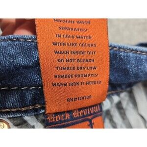 Rock Revival Alivia Size 26. Easy Straight, distressed blue jeans. Low rise, zip fly, with stretch. Slim fit that is straight from knee to hem. Excellent pre-owned condition. No stains or wear on the back legs from heel wear. Non-smoking home. Measurements laying flat: