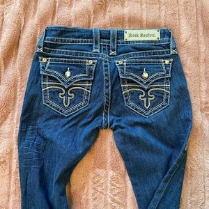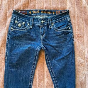 Rock Revival Celine Boot Cut Jeans, Size 28, EUC - no flaws. Large rhinestone studs on pockets and buttons, white stitching and emblem. Rear pocket flaps close. Medium wash. Measures: 30" waist and 33" inseam.kd
