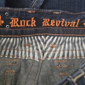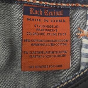 Rock Revival Celine Cropped Bermuda Gold Threading Distressed Women's Shorts 31 Medium Wash, Whiskering, and In Excellent Condition. Approximate Measurements (flat) Inseam 16.5" Waist 15.5" Rise 8" Bin 8027