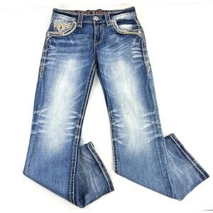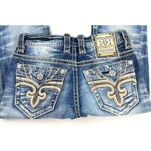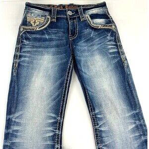 Rock Revival Chavo Bootcut Stretch Jeans Mens 29x31 Embroidered Leather Inserts.