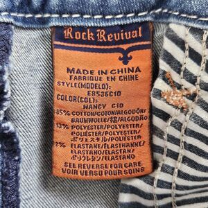 Gently pre-owned Rock Revival jeans, the Nancy, size 29. They feature heavy stitching and rhinestones on light washed denim.