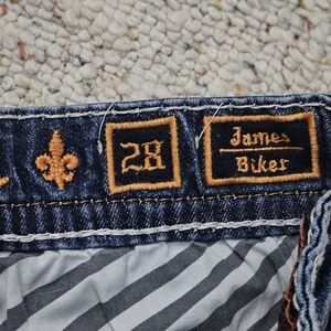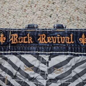 Mens Rock Revival dark blue skinny jeans with distressed details. Features unique stitching and stylish design. Perfect for casual outings or even dressy/casual!