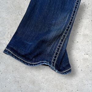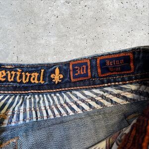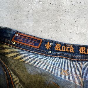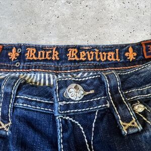The Rock Revival Irina Boot Jeans in women's size 30 feature a distressed denim design with embroidered accents, adding a touch of rock-inspired flair.