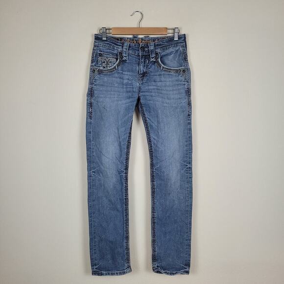 Rock Revival Jayin Jeans Womens 29 Blue Fleur-de-Lis Flap Pockets Slim Straight