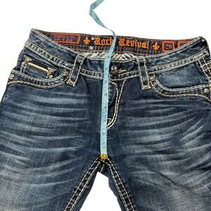 Rock Revival Kelly medium wash skinny jeans with back flap pockets. Women's size 28.