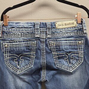 Features: Rhinestone/logo hardware on pockets; metal Rock Revival back patch