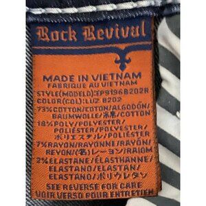 Rock Revival Luz Boot Blue Denim Jeans 25x29 Stretch Flap Pockets Bling Rhinestones Embroidered Leather Inlay Detailed Stitching Medium Wash Low Rise. Great Pre-Owned Condition Gently Worn. Ships from smoke free home.