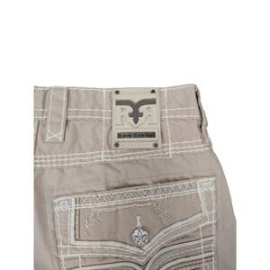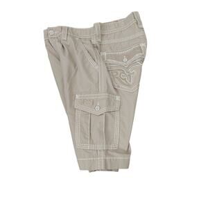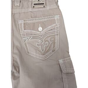 Rock Revival Mens Size 34X24 Classic Cargo Khaki Shorts Thick Stitch Embroidered