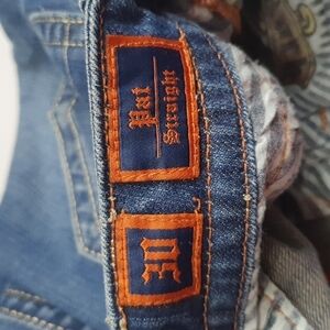 Features: button closure, straight legs, 5 pocket styling, embelished back pockets
