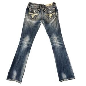 Keywords: Band Rock Revival, Penny Boot, RE82588L, size 28, mid‑rise bootcut, distressed denim, rhinestone jeans, Y2K vintage, early 2000s style, Buckle exclusive, stretch denim, rockcore, streetwear, bling pocket jeans, statement denim, textured jeans, collectible denim, retro fashion, contrast stitching, signature Rock Revival, ripped jean, medium wash, boho grunge, ed hardy style, rock of love aesthetic, embellished cowboy jeans