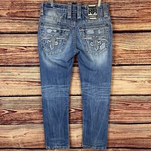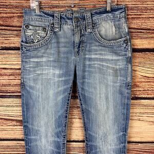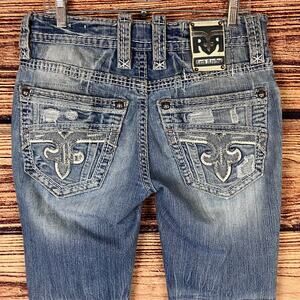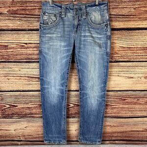 Rock Revival Phantom Slim Straight Leg Denim Jeans in 8/10 condition due to the faint spot shown near the front pocket (see pics). Men's size 31, 16.5 inches across the waist, 41 inches is the length, 30.5 inches is the inseam. Always willing to do lower pricing on bundle deals.