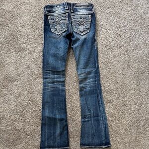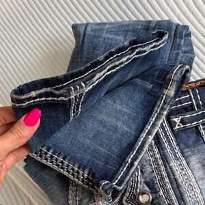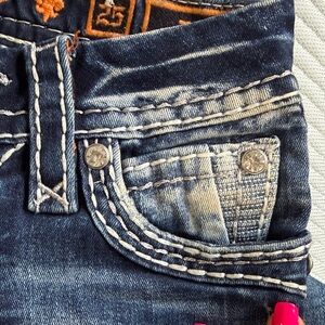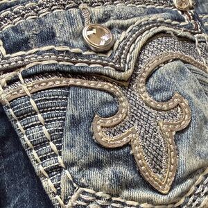 Stylish dark blue jeans with intricate pocket detailing. Rock Revival signature style. Perfect for casual outings.