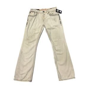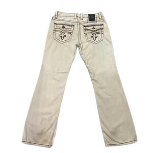 Modern Rock Revival denim featuring boot cut design with detailed stitching. Rugged and stylish. With stains on front and back see photos.