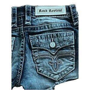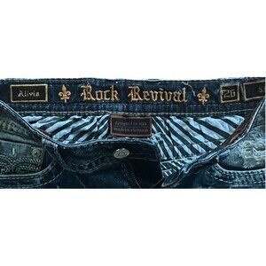 Rock Revival Alivia Shorts Jeans Cut Off Distressed Fray Raw Hem Ripped Holes with Striped Pockets Lining Embroidered Stitching Faux Flap Pockets Leather Logo Tag Logo Buttons Rivets Zip Button Closure