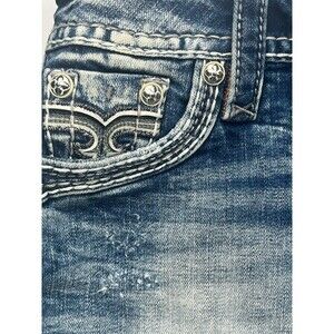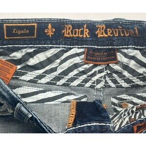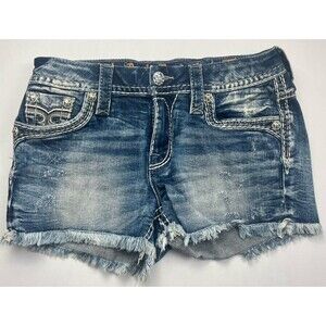 Rock Revival Shorts Jean Cut Off Distressed Frayed Raw Hem Embellished Medium Wash Blue Denim