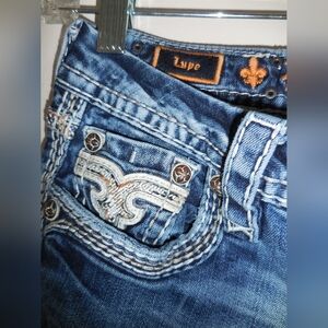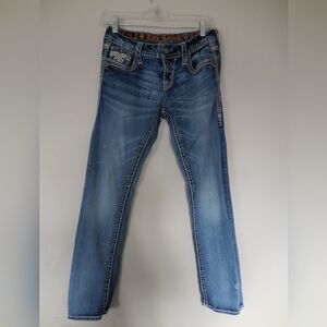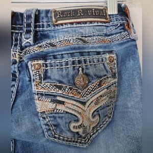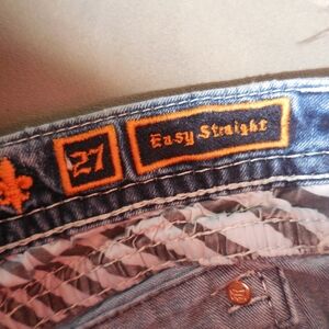 good preowned condition Rock Revival Womens Lupe Easy Straight Leg Jeans Size 27 Orange/white/cream Stitching. missing e in revival above back pocket. Stylish blue jeans with intricate back pocket embellishments. Perfect for casual wear.