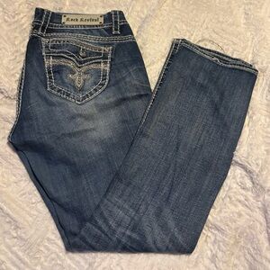 Chic blue jeans with intricate pocket stitching. Eye-catching design for casual wear. Preloved. small hole on back lower right leg as shown in picture.