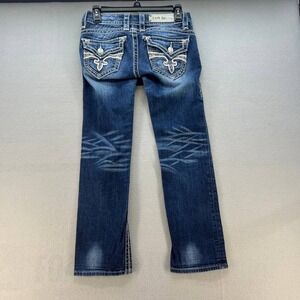 Rock Revival Women's Heather Capri Denim Pants. Tagged size 29 (2). Embellished button flap back pockets - with sequins. Medium denim wash with whiskering. Low rise. In good preowned condition with minimal signs of wear.