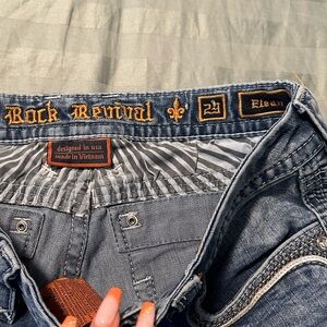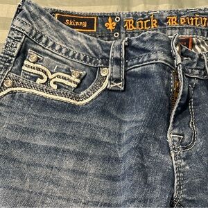 Stylish straight leg jeans by Rock Revival. Dark blue wash with signature stitching. Perfect for casual wear.