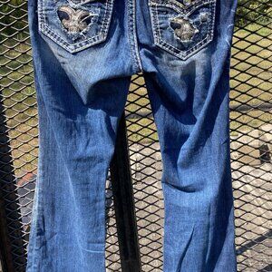 Rock Revival women's jeans, style "Fay". Easy boot cut, size 28 waist, standard length. Gently used, looks like new, no wear or stains. Great blingy back pockets, distressed look, fun stitching.