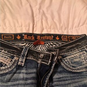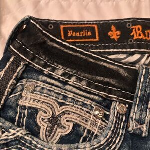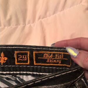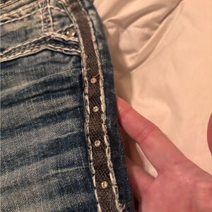 Trendy midrise dark blue denim jeans with Rhinestone accents on pockets and sides. Perfect for casual wear.