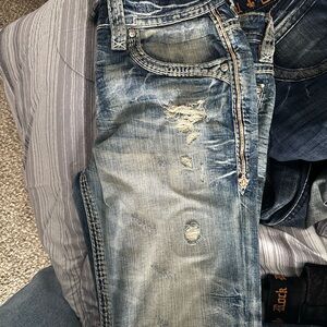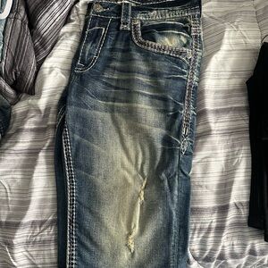 Men’s Rock Revival jeans with intricate pocket detailing. Perfect for a casual look! Selling as is. Willing to sell as a bundle deal 6 pair shorts & pants for $300 or best offer or each pair for $70 a piece! Specify which pair you would like to purchase please. Sizes 34s & 36