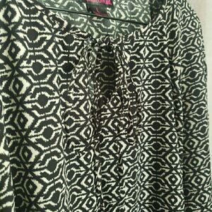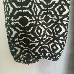 The Rock & Roll Cowgirl Black White Geometric Long Sleeves Dress is a stylish and versatile piece perfect for a party or casual outing. Made from polyester fabric, this knee-length dress features a V-neckline and pullover closure for easy wear. The dress showcases a shift style with a tie accent and elastic long sleeves for added comfort and convenience. With a Southwestern Cowgirl theme and geometric pattern, this dress in size L is a fashionable choice for the seasons of summer, fall, and spring. Made in India by the brand Rock And Roll Cowgirl, this dress is machine washable for easy care.