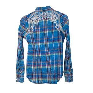 Rock & Roll Cowgirl Blue Plaid Western Snap Button Shirt SZ M Embroidered
