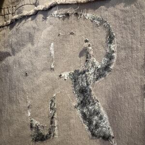 Shows wear with intentional distressing: raw/frayed hem and pocket edges, and heavy cracking/fading on the back "ROCK & ROLL" graphic as pictured. Light overall wrinkling and minor signs of use from handling. Buttons and buttonholes are intact; no holes or stains observed. Please review photos to confirm condition.