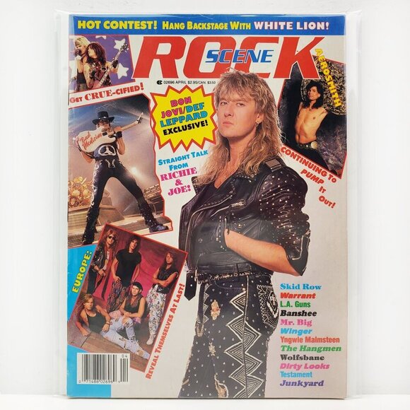 Rock Scene magazine April 1990 issue, sleeved and boarded. Features Skid Row, Motley Crue, Aerosmith, and more. Please note some light shelf life age, shown. This is an unread, unsold issue from a now defunct newsstand business in the Washington, D.C. area. Ships safely padded in a secure box :)