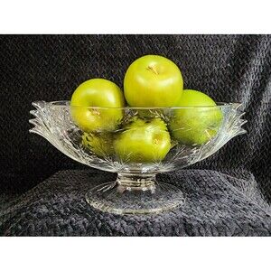 Measuring approximately 14" wide (handle to handle), 7.5" deep, and 6" tall, this versatile bowl is perfect as a fruit bowl, centerpiece, or serving dish for special occasions. The craftsmanship reflects the refined elegance of mid-20th-century crystal, making it a stunning addition to any dining room, sideboard, or display cabinet.