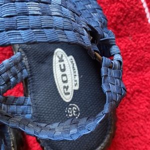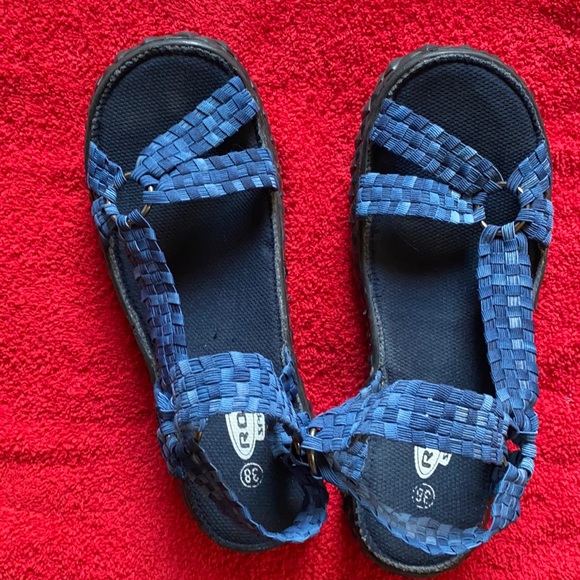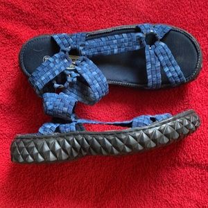 Super cute. Blue material with Black soles. Sturdy sandals! Like new!
