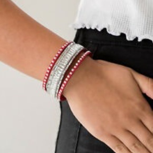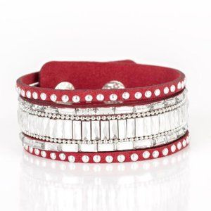 Shiny silver studs, dainty silver ball chains, and edgy white emerald-cut rhinestones race along a spliced red suede band for a rock star look. Features an adjustable snap closure.