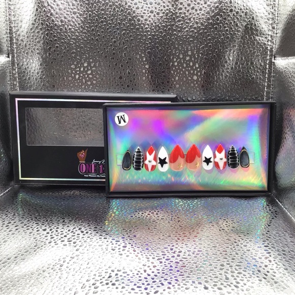 Modern nail art set featuring red and black designs with Hold accent. Perfect for creative nail styling. Our premium press on nails are handcrafted and reusable. Each set includes a professional application kit.