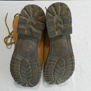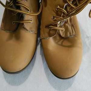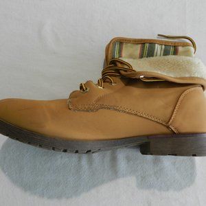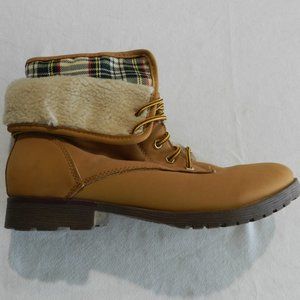 Camel color lace up boots with red/green/cream plaid pattern and faux shearling shown when folded down. Worn once.